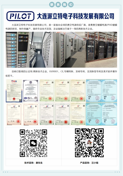 大連派立特電子科技發(fā)展有限公司,是一家面向全球的真空電源供應廠商,是集真空鍍膜電源/PVD鍍膜電源的研發(fā)、制作到量產(chǎn),提供專業(yè)技術(shù)咨詢,及設(shè)備解決方案于一身的高新技術(shù)企業(yè)。 主要在售電源品類如下,已廣泛應用于諸多業(yè)內(nèi)頭部企業(yè)并得到高度認可,支持按需定制: 多弧電源 燈絲電源 清洗電源 轟擊電源 靜電吸附電源 脈沖弧電源 中頻濺射電源 脈沖偏壓電源 離子源電源 直流磁控濺射電源 直流脈沖濺射電源 and so on... 目前已取得的認證有:高新技術(shù)企業(yè),ISO9001,CE,專精特新,發(fā)明專利、實用新型專利及美術(shù)、軟件著作權(quán)若干。